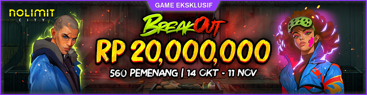 Breakout Cash Drop oleh Nolimit City berlangsung 14 Oktober – 11 November 2025, setiap hari pukul 12:00 – 11:59 WIB. Total hadiah Rp 20.000.000 dibagikan kepada 560 pemenang dalam 4 periode.